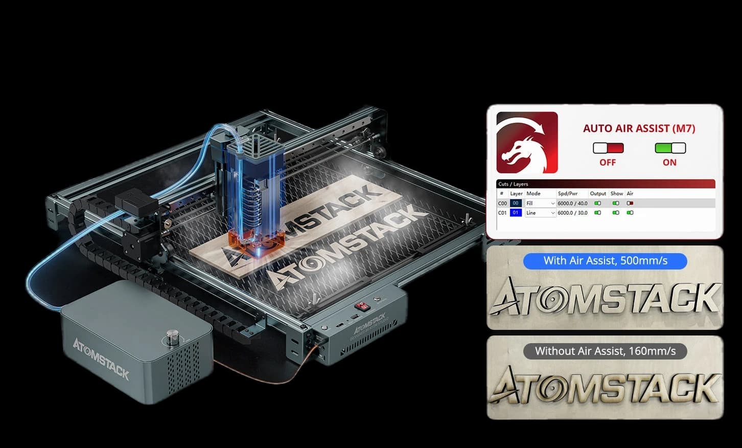 AtomStack A40 Pro V2 Laser Engraver with F60 Air Assist Kit vs Longer B1 20W Laser Engraving Machine, xTool P2S 55W Desktop CO2 Laser Cutter for Education