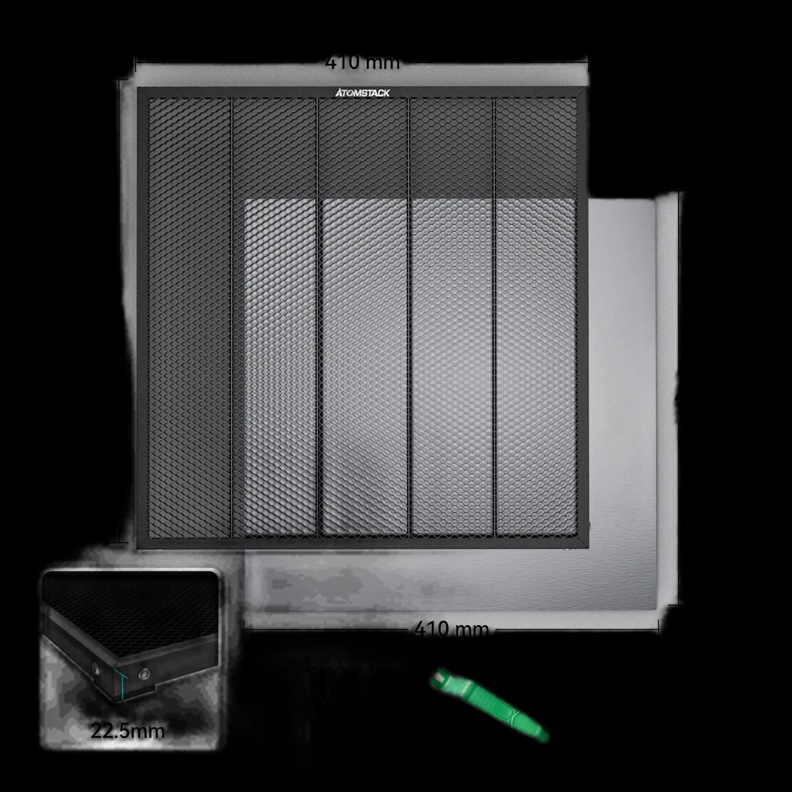Upgrade your laser engraver with the AtomStack F4N Honeycomb Working Table. This sturdy platform features a robust honeycomb frame for rapid heat dissipation, efficient smoke exhaust, and enhanced cutting precision for superior results. The large 410x420x22.5mm work surface accommodates most projects. Its smooth edges protect your hands, while anti-slip pads and six platen ensure your material stays secure and stable. The dual protection design prevents scorching your project and your desk, guaranteeing clean, flawless finishes every time. Achieve professional-grade cutting effects with this essential upgrade.