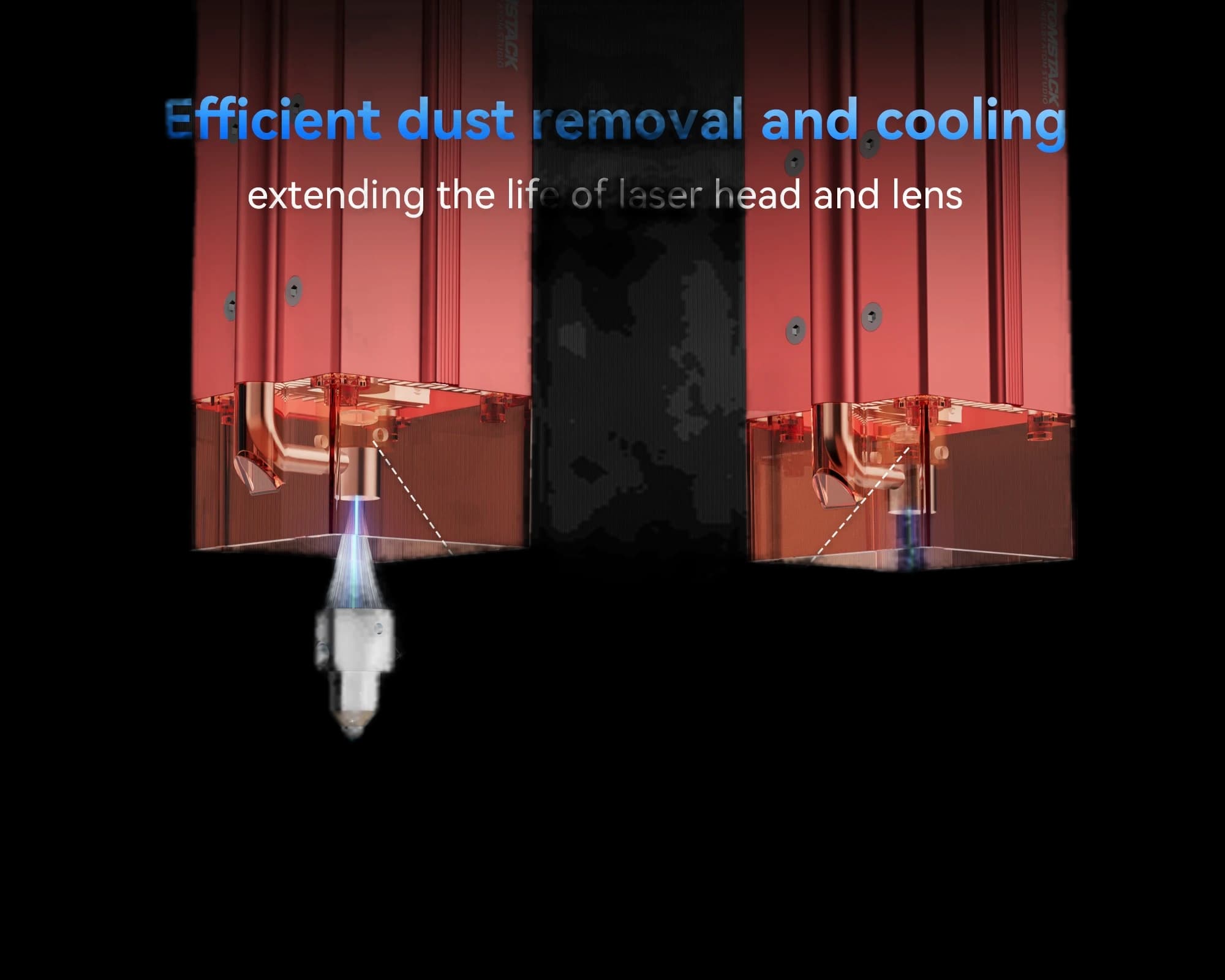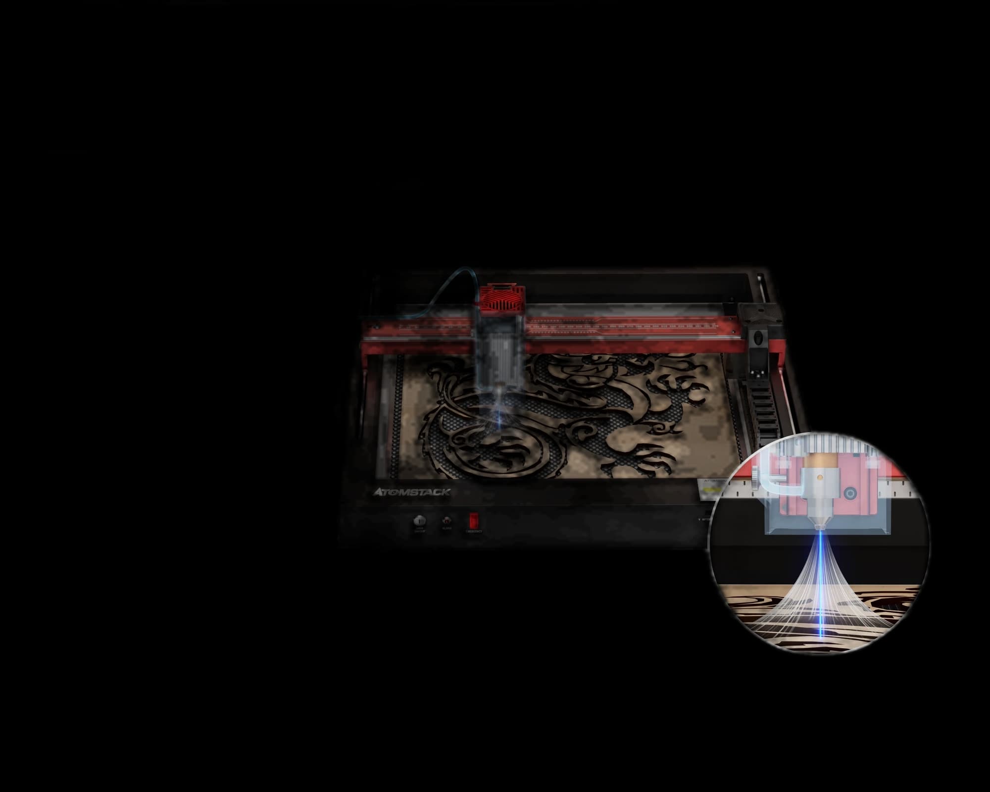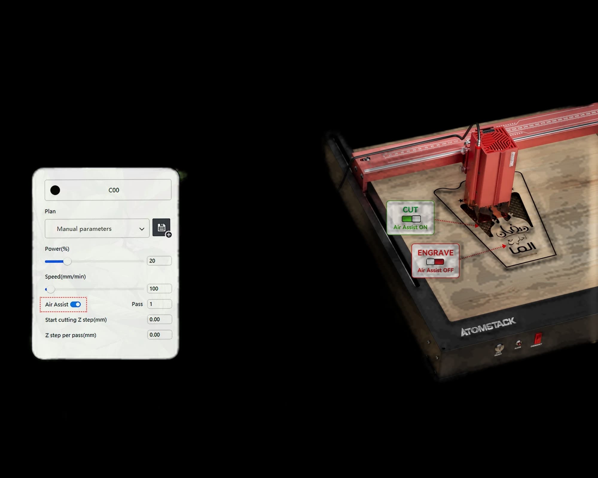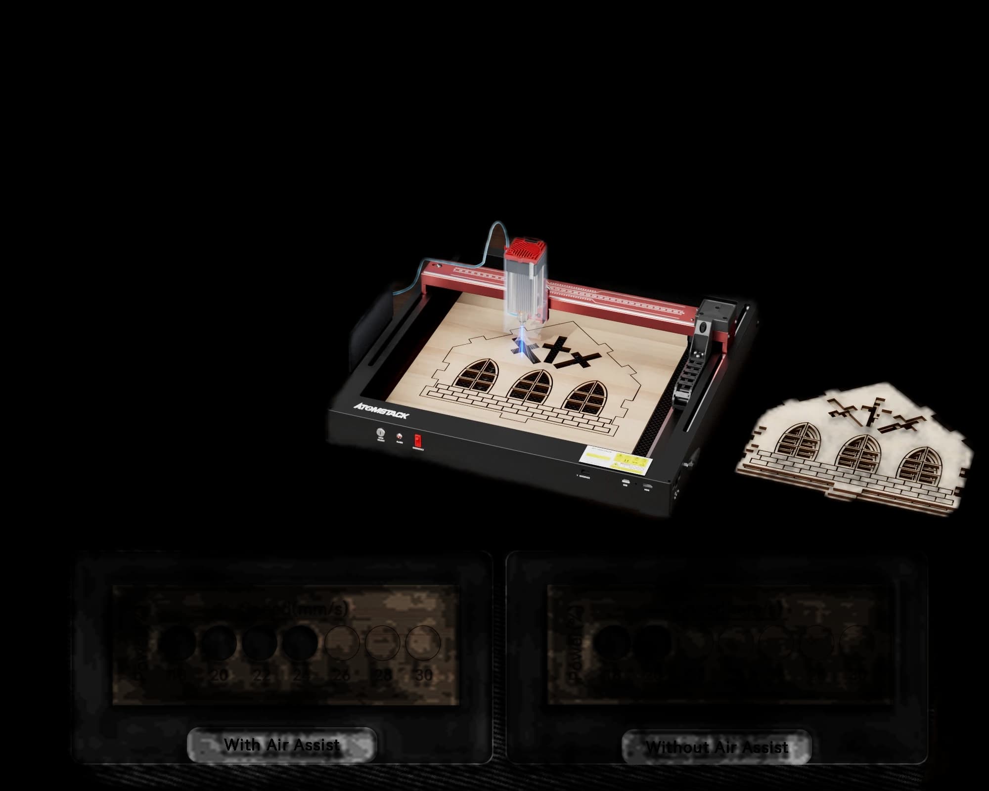 Elevate your laser engraving and cutting to the next level with the AtomStack F80 Air Assist Set. This intelligent and powerful airflow system significantly enhances your machine's performance and work quality. Enjoy seamless integration with AtomStack software for a truly streamlined workflow. With a massive 60L/min airflow, the F80 effortlessly handles high-intensity cutting tasks, ensuring optimal performance on demanding materials. Achieve up to 20% faster cutting speeds without compromising quality. The powerful air assist blows away debris and smoke, resulting in flawlessly smooth, clean edges with no burn marks. Perfect for any serious laser project. Dimensions: 150 x 188 x 98mm. Net Weight: 1.14kg. Power: 24V/3A.