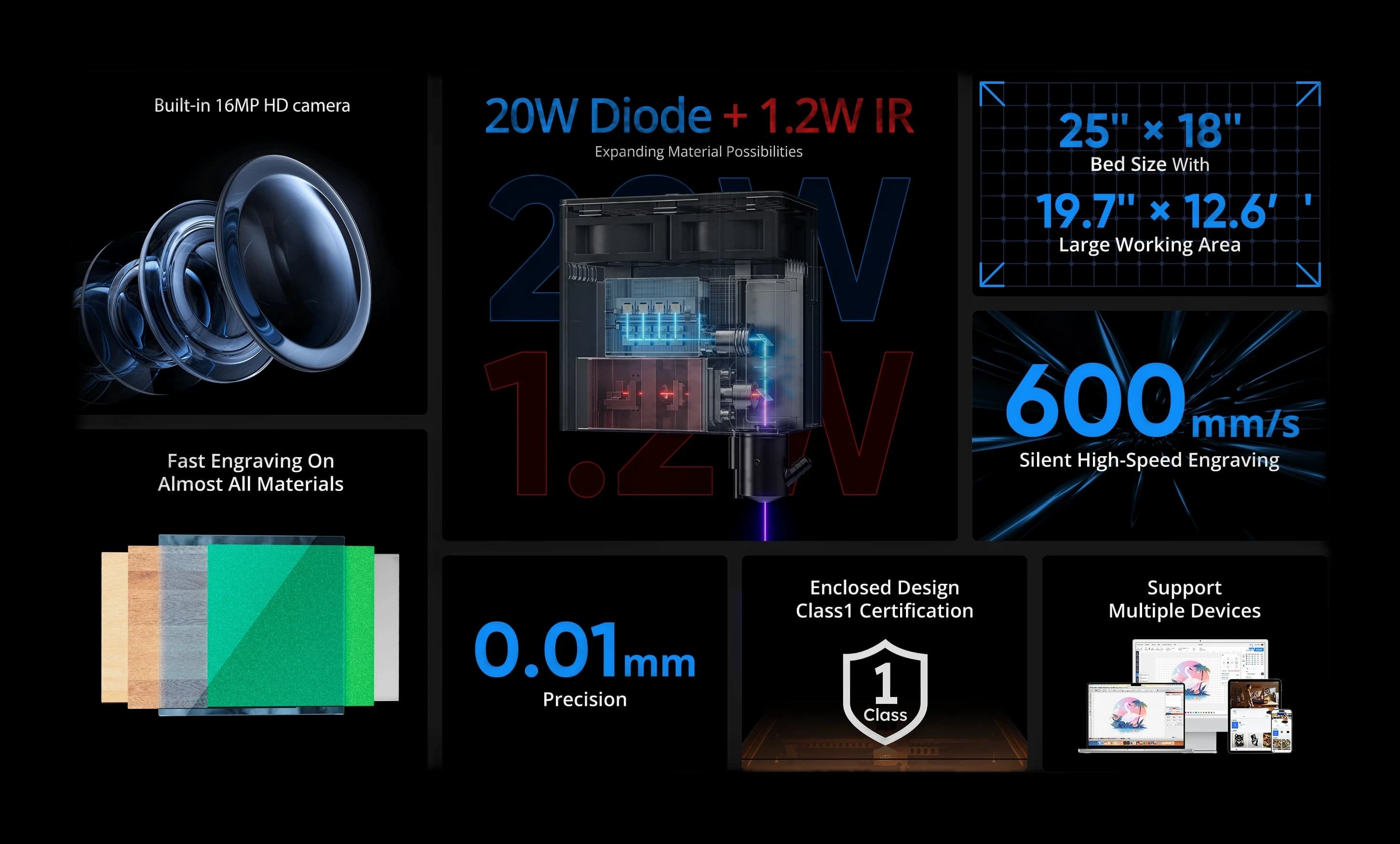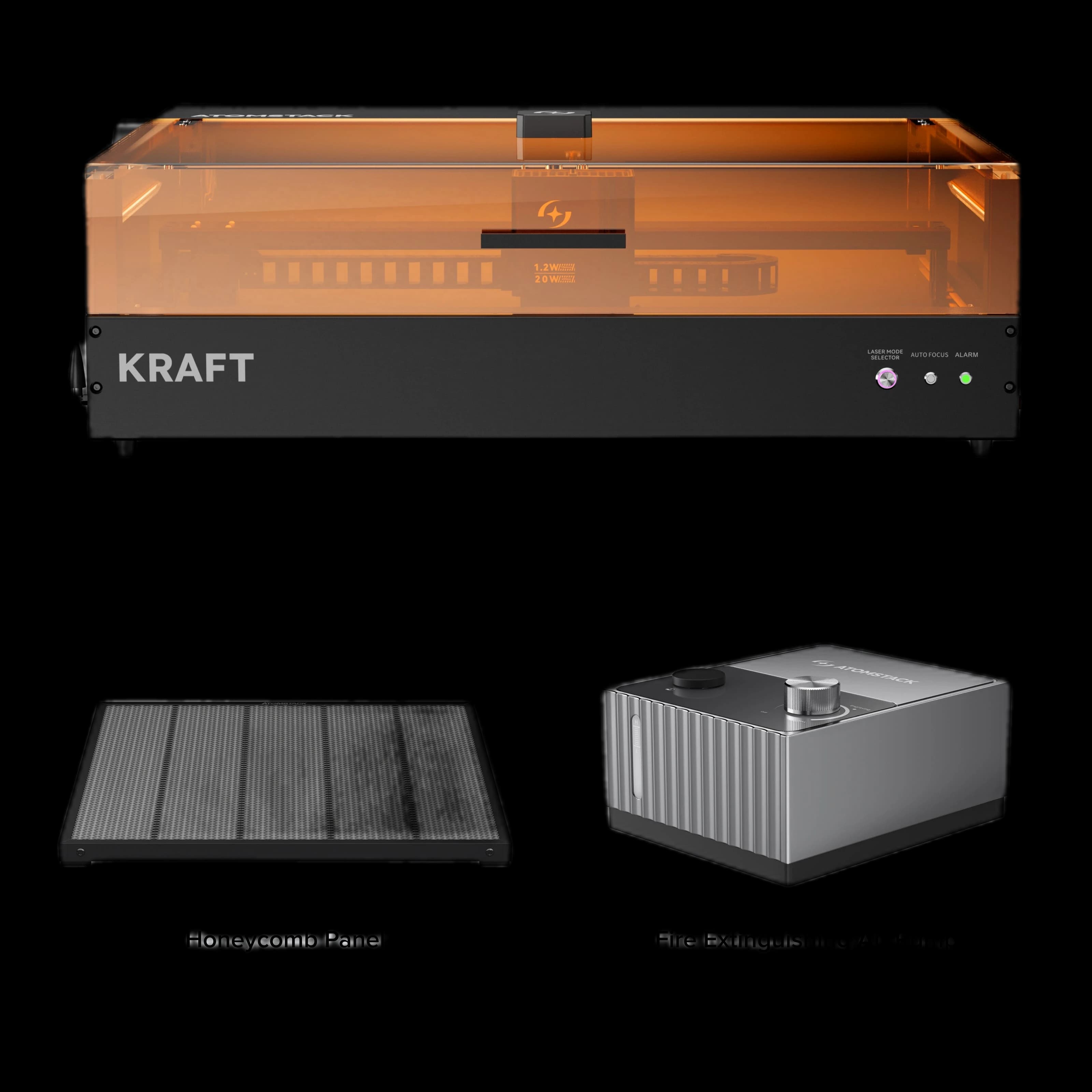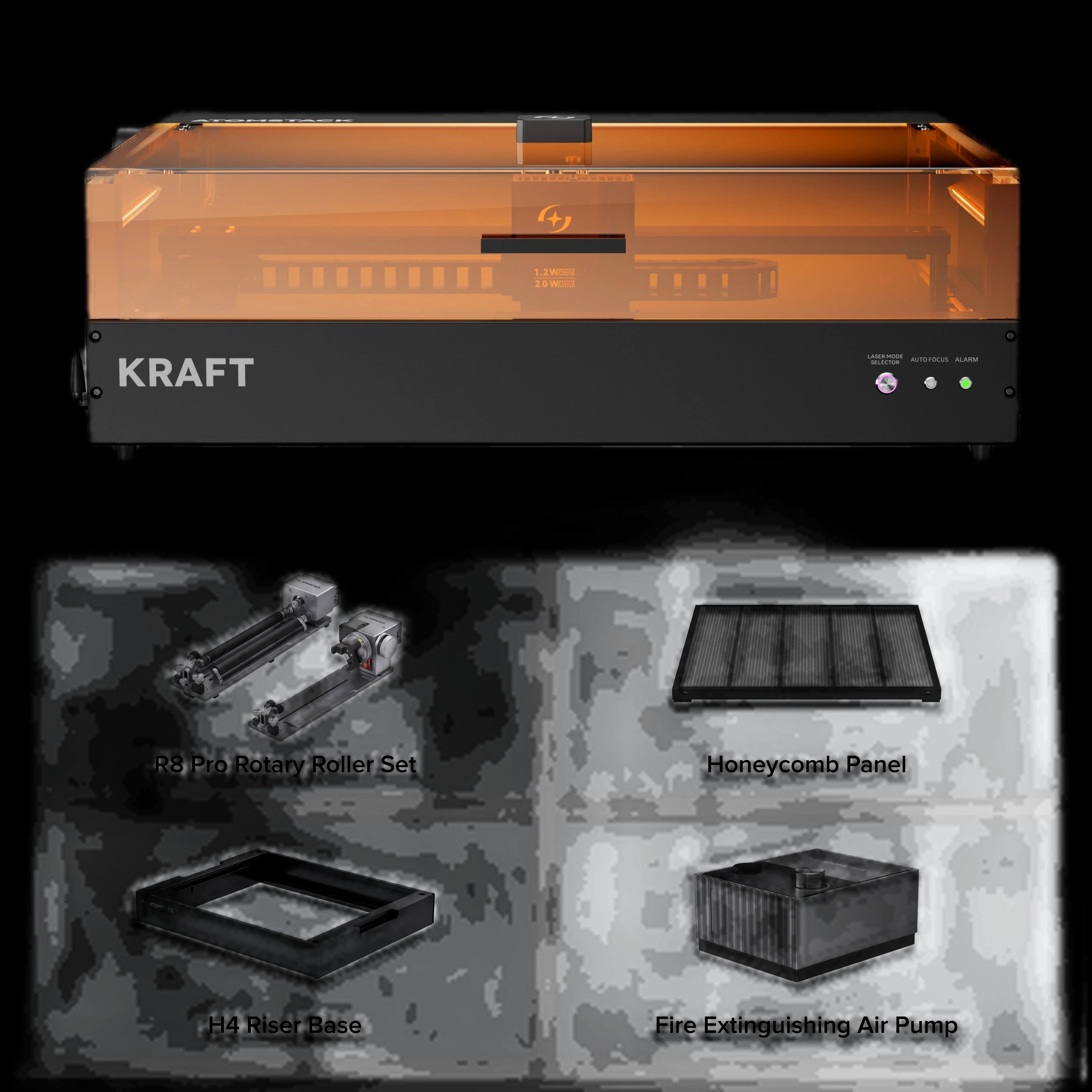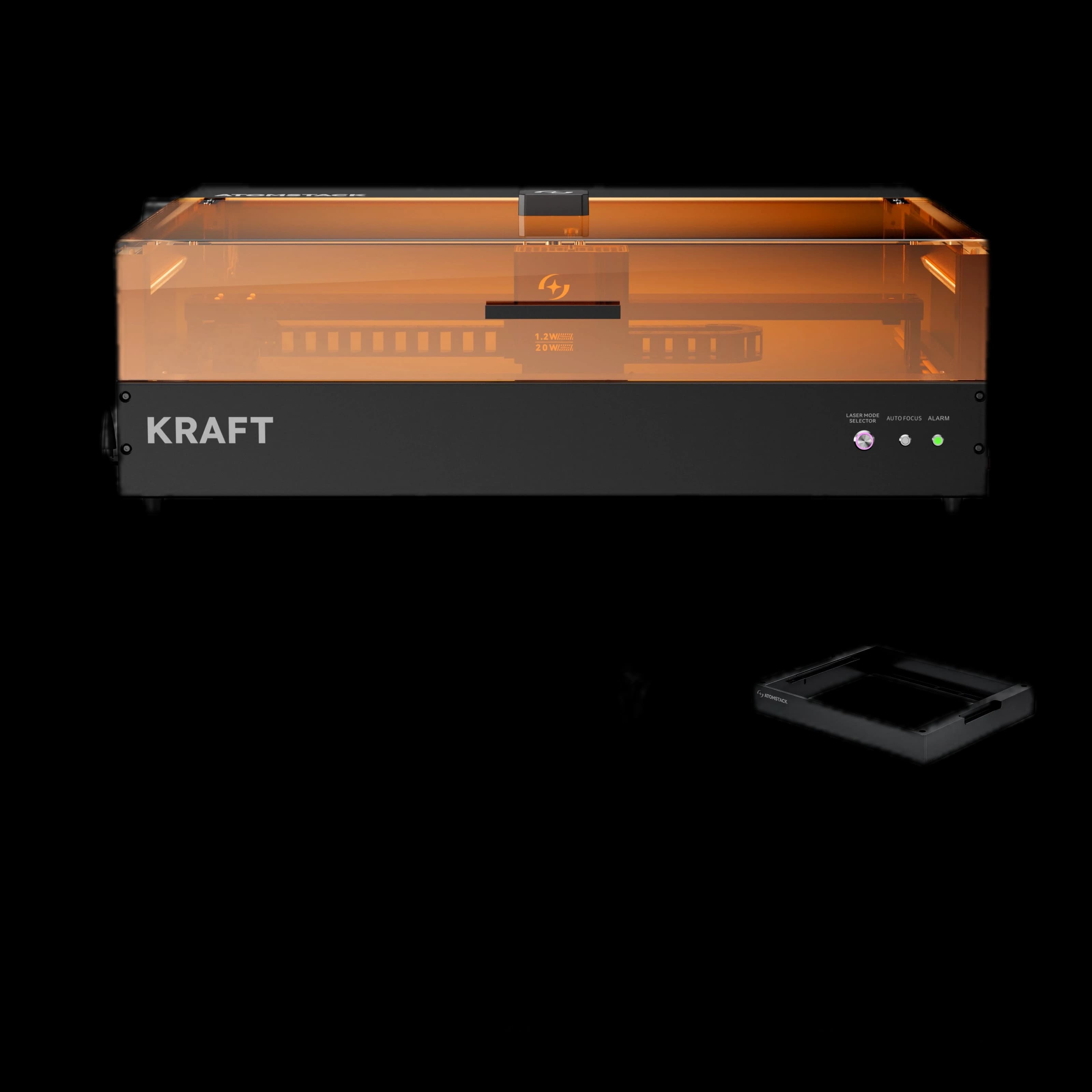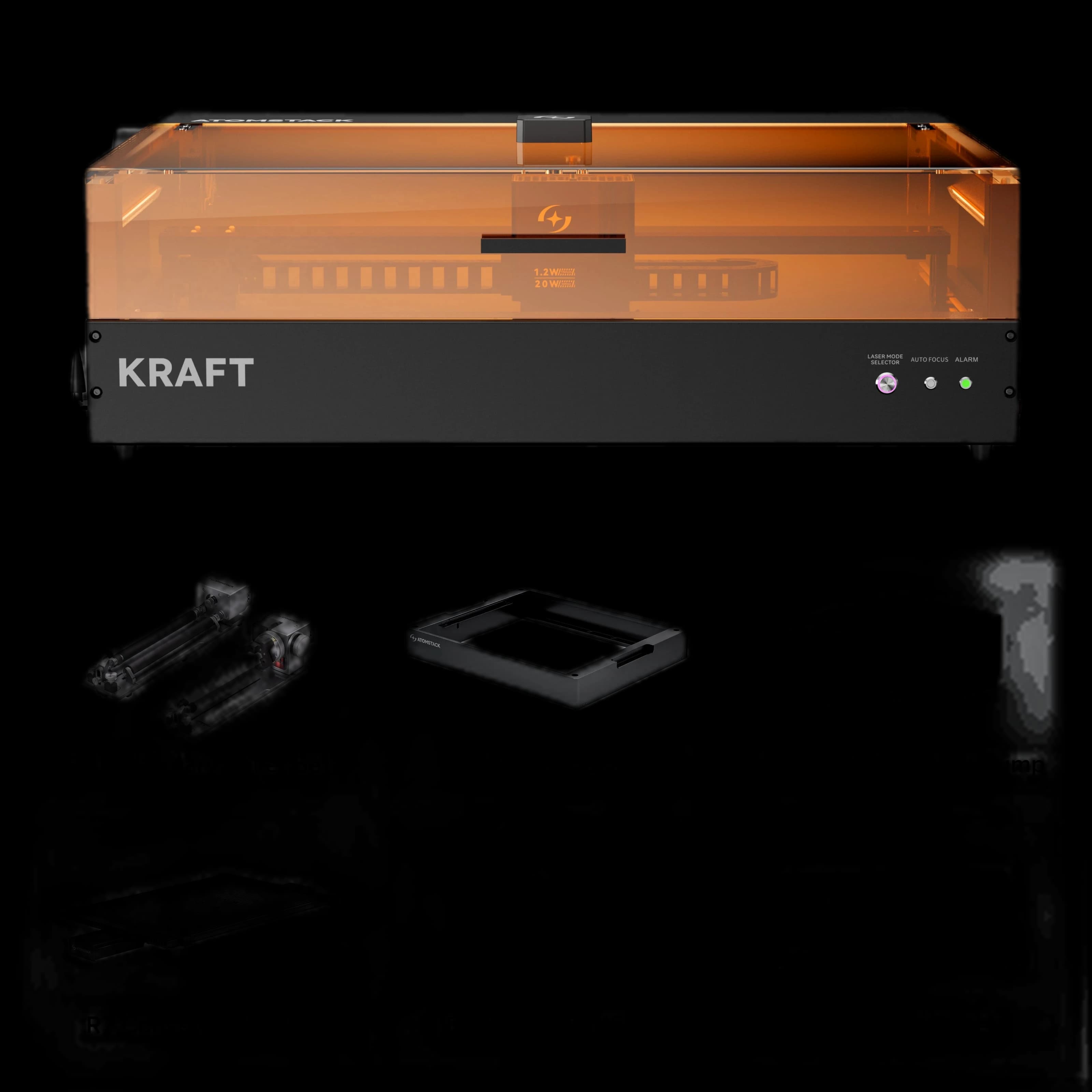 Discover the world's first synchronized dual-laser engraver, the AtomStack Kraft. This advanced machine combines a 20W diode laser and a 1.2W IR laser, working in perfect sync for enhanced performance. Easily switch between three laser modes with a single button for maximum versatility. AtomStack Kraft delivers rapid and precise engraving and cutting on a wide range of materials, from wood and metal to acrylics. Ideal for both professionals and hobbyists seeking a reliable, high-quality tool. The synchronized dual-laser system ensures uniform results and exceptional detail. Boost your productivity and achieve flawless finishes with AtomStack Kraft.