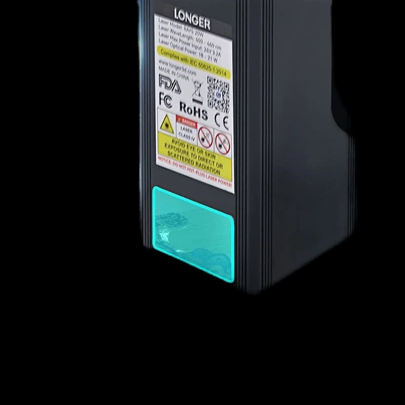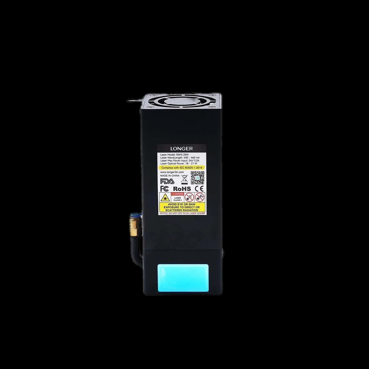 Upgrade your Longer Ray5 with this powerful 20W laser module. This module is designed for enhanced cutting, handling up to 15mm pine wood and 8mm acrylic in a single pass. Achieve high-precision DIY laser engraving and cutting with a 0.08x0.1mm² spot size. Create vibrant multi-color engravings on metal surfaces to bring your creations to life. The module is equipped with an XY-axis limit switch, a protective laser lens, a dust-proof hood, and an air assist interface. This is the perfect upgrade kit for your Ray5 5W or 10W model.