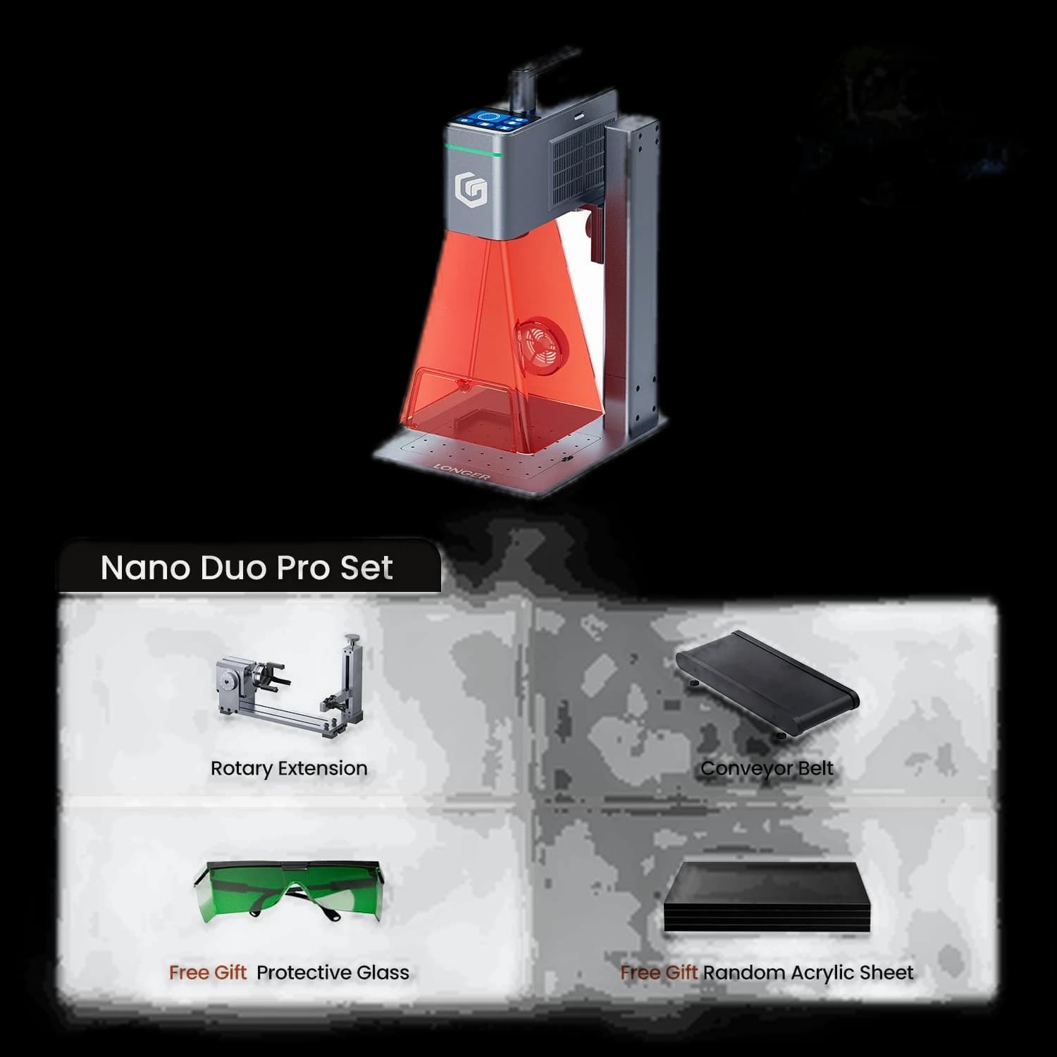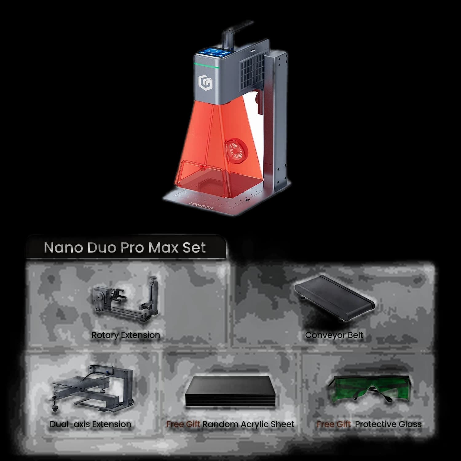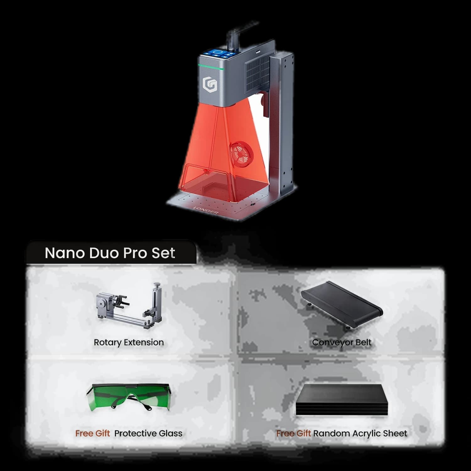 The Longer Nano Duo AI Laser Engraver maximizes creative efficiency with its self-developed AI, featuring intelligent design, auto-positioning, and auto-filling capabilities. It offers dual laser power options: a 20W blue diode laser and a 2W infrared laser, meeting diverse engraving and cutting needs. The industry's first dual-axis extension expands the working area to 300mm x 300mm and supports vertical cutting for expanded creative possibilities. Its compact and portable design makes it ideal for home and small workshops. The user-friendly interface, including intuitive software and the proprietary LaserBurn app, ensures seamless setup and operation.