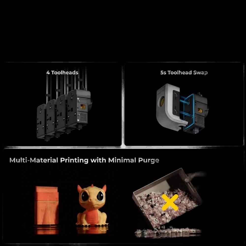 The Snapmaker U1 3D Printer delivers smooth printing with up to 5x faster speeds and 5x less waste. Featuring the innovative SnapSwap™ 4-Toolhead System with a 5-second tool change, it excels at multi-color and multi-material printing. All four toolheads work in unison, while auto filament loading ensures seamless operation. With a max speed of 500 mm/s, acceleration up to 20,000 mm/s², and a 270x270x270mm³ build volume, it handles complex projects with ease. Ideal for creators and professionals who demand high performance and versatility in their 3D printing workflow.