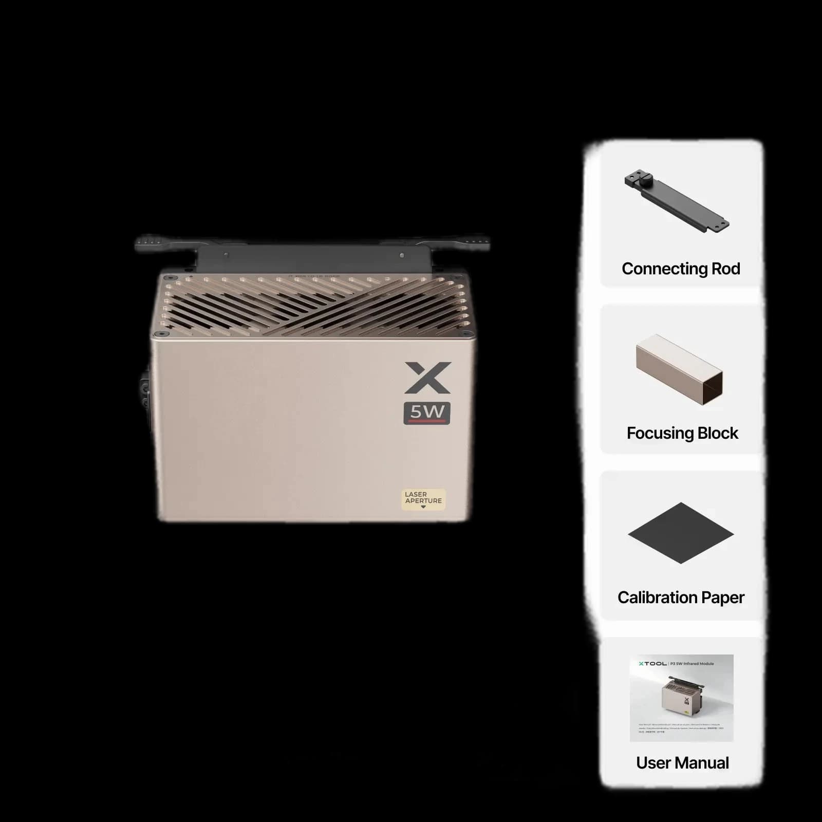 The 5W IR Laser Module for xTool P3 significantly expands your laser cutter's capabilities, enabling precise engraving on a wide range of materials. With a power output of 5W and a wavelength of 1064 nm, this module is specifically designed for processing transparent and reflective materials like acrylic, glass, metal, and plastic. It offers fine resolution and high detail accuracy, making it ideal for professional engravings and custom designs. The module is easy to install and integrates seamlessly with the existing xTool P3 software, ensuring intuitive operation and quick setup. Its compact design and high reliability make it suitable for both hobbyists and professionals seeking precise and versatile processing options. The IR laser module is the perfect addition for creative projects that go beyond the capabilities of traditional CO2 lasers.
