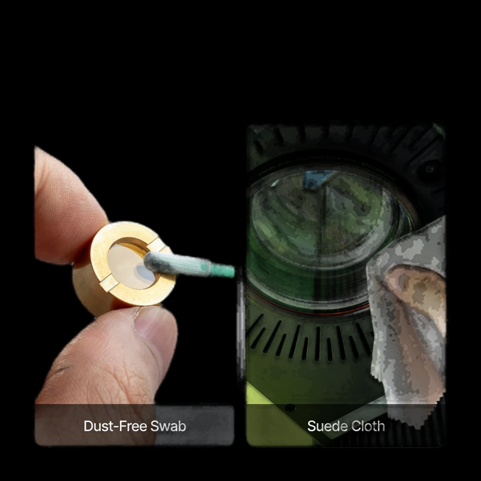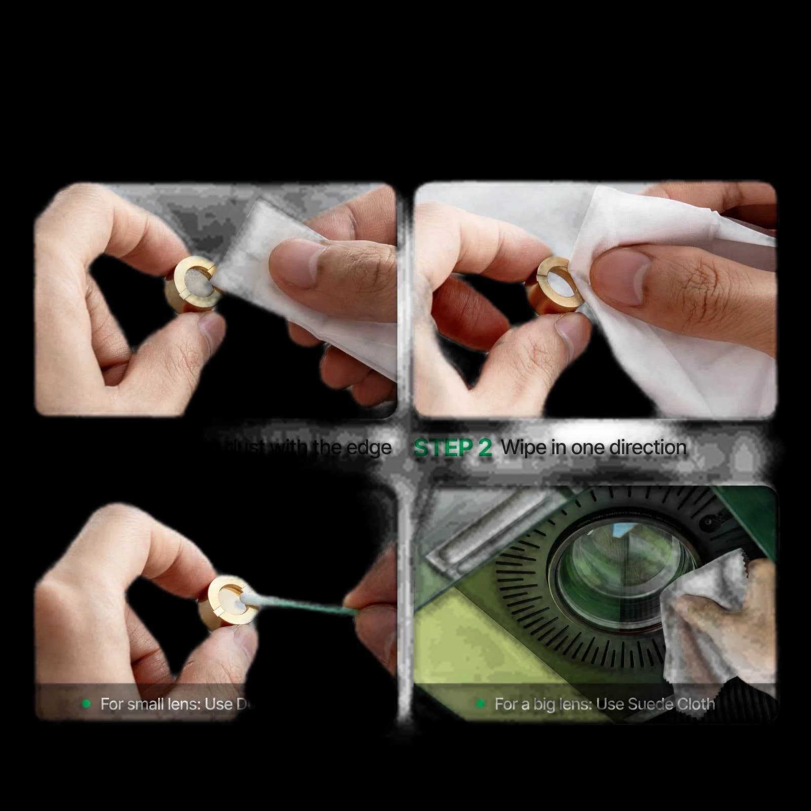 The xTool Lens Cleaning Kit includes 200 dust-free swabs and 20 reusable suede cloths. This versatile set is ideal for the thorough and gentle cleaning of your laser cutter or engraver's lenses. Regular maintenance ensures optimal performance, consistent engraving quality, and extends the life of your equipment. The dust-free swabs protect sensitive surfaces from scratches, while the soft suede cloths effectively remove dust and debris. Invest in flawless results and prolong the life of your device with this professional cleaning kit from xTool.